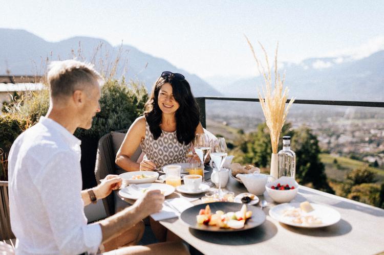 Gemeinsamer Aperitif in der romantischen „Amazing View Outdoor Lounge“ in Dorf Tirol. Auf lauschigen Sesseln beim süßen Nichtstun entspannen und den spektakulären Ausblick wirken lassen. Raffinierte Cocktails und kleine Leckereien versüßen Ihnen den Genussurlaub in Südtirol. Den „Schau wie schön – Moment“ auskosten – bei einem Snack à la carte aus unserer kleinen Nachmittagskarte. Fühlen Sie sich dabei auf unserer „Amazing View – Outdoor Lounge“ über den Dingen.